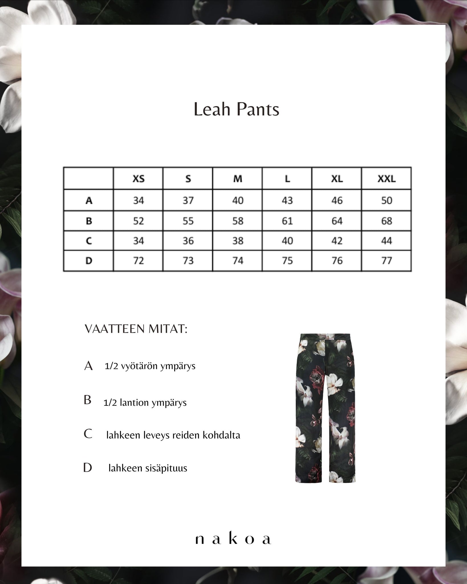 Nakoa -merkin Leah housut upeassa Noir kuosissa.