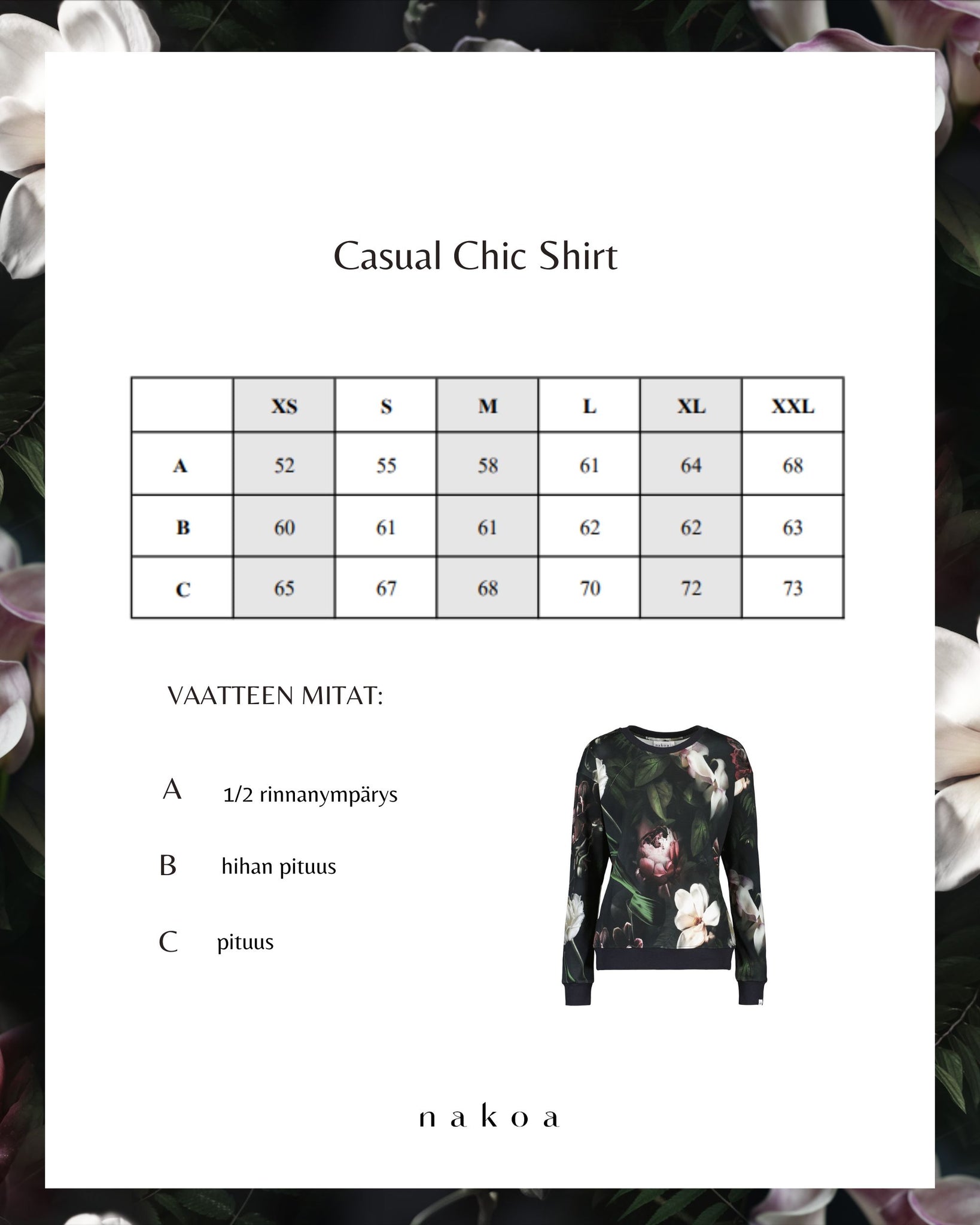 Casual Chic Shirt collegepaita - helppo valinta niin toimistolle kuin kaupungille, jota koristaa upea ja tumma Noir kuosi. Paita sopii kauniisti farkkujen ja hameiden kanssa, kuin mekkojen kaveriksi. Pukemalla alle kauluspaidan, saat kauniin toimistolookin. Asusteilla ja koruilla on helppo luoda vaihtelua haluamaasi tyyliin.