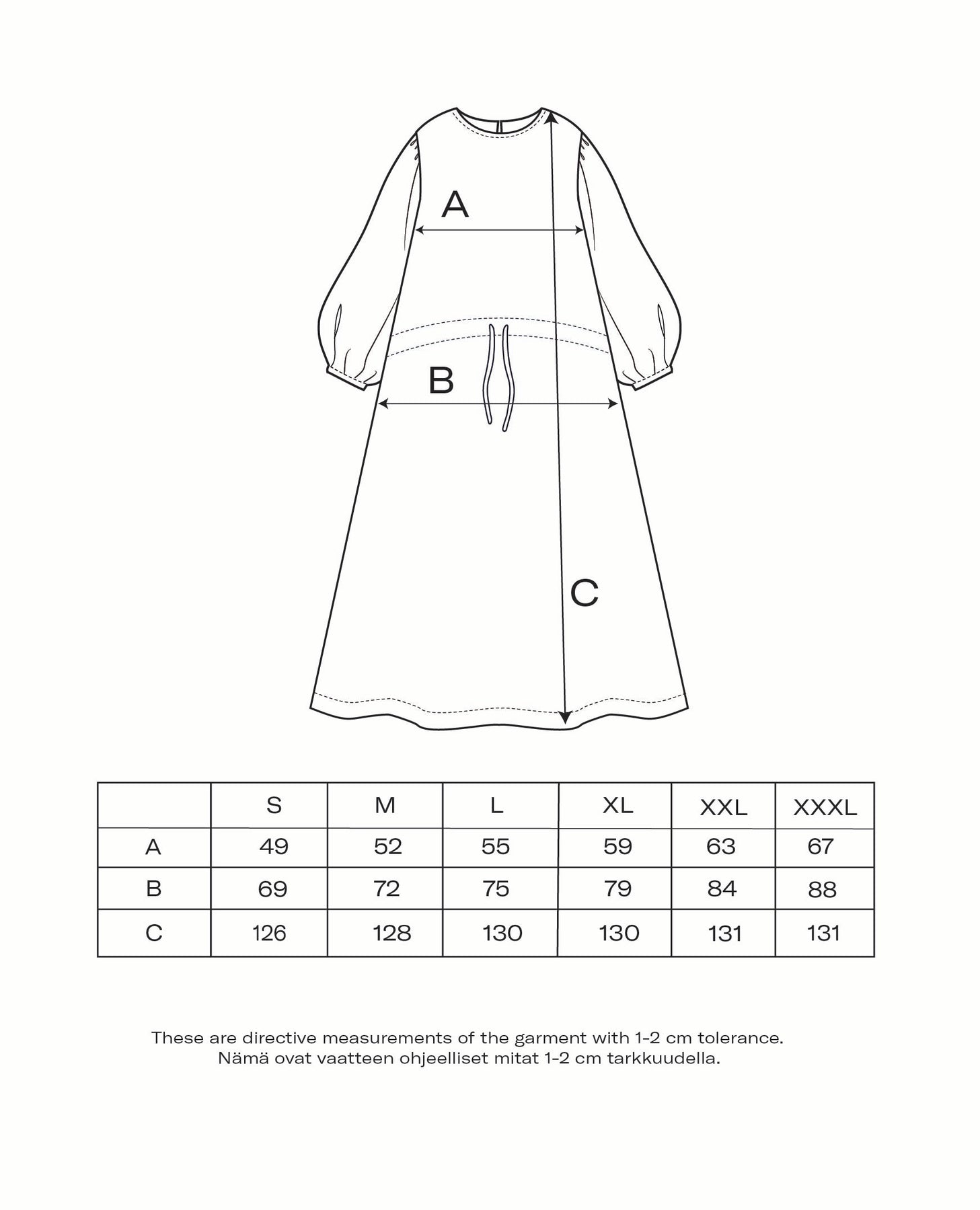 Vyötäröllä piilotettu kiristysnyöri, jolla voi säätää mekon istuvuutta. Pitkät hihat ja levenevä helma, sekä kätevät taskus sivusaumoissa.