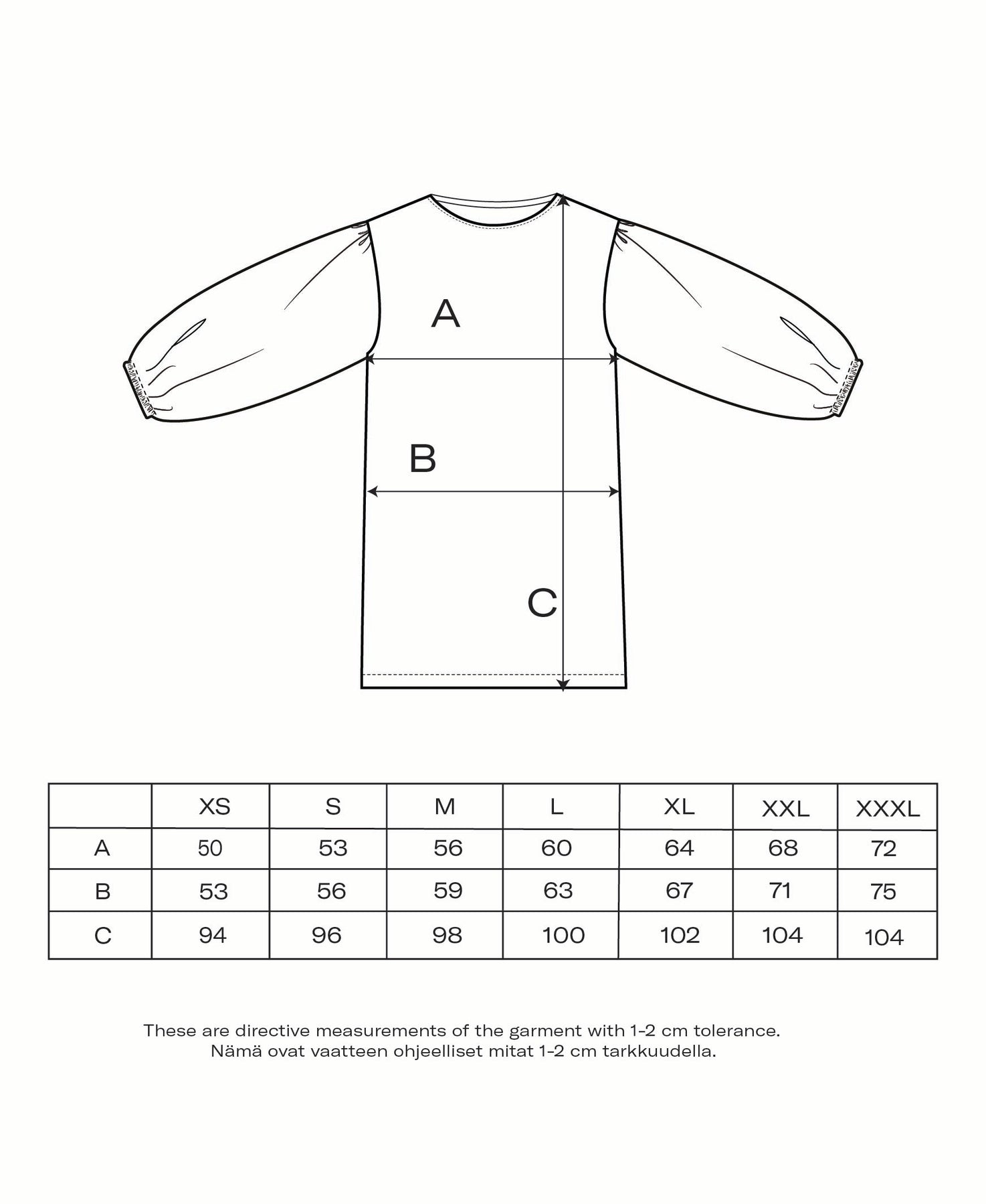 Tunikassa pitkät puhvihihat ja suora helma, sekä kätevät taskut sivusaumoissa.