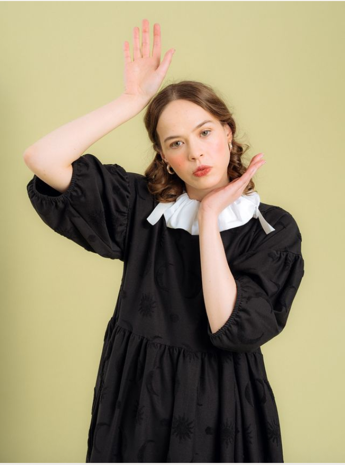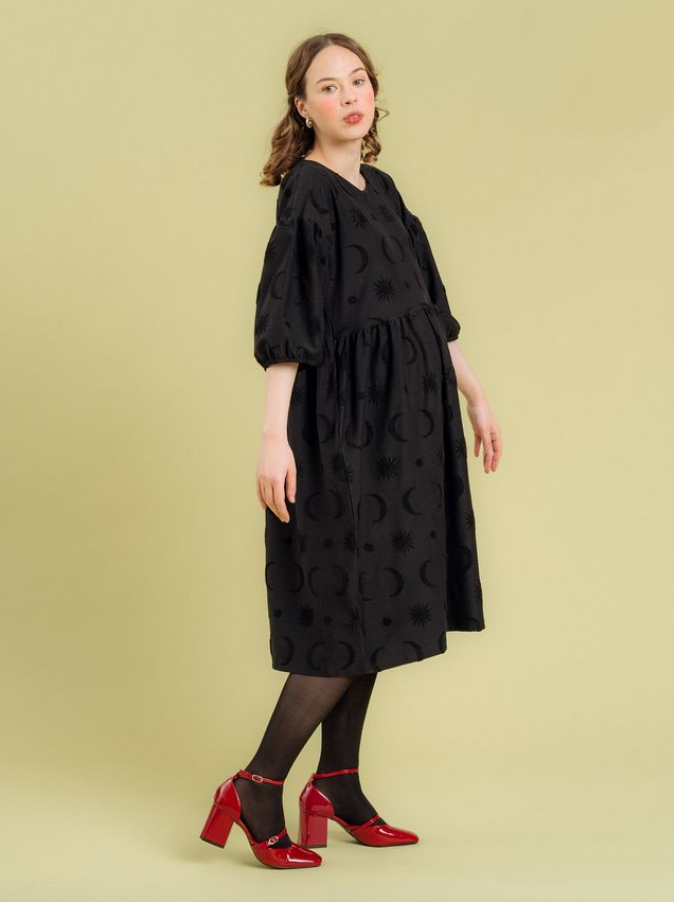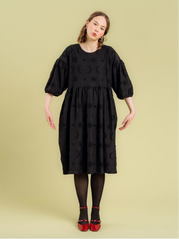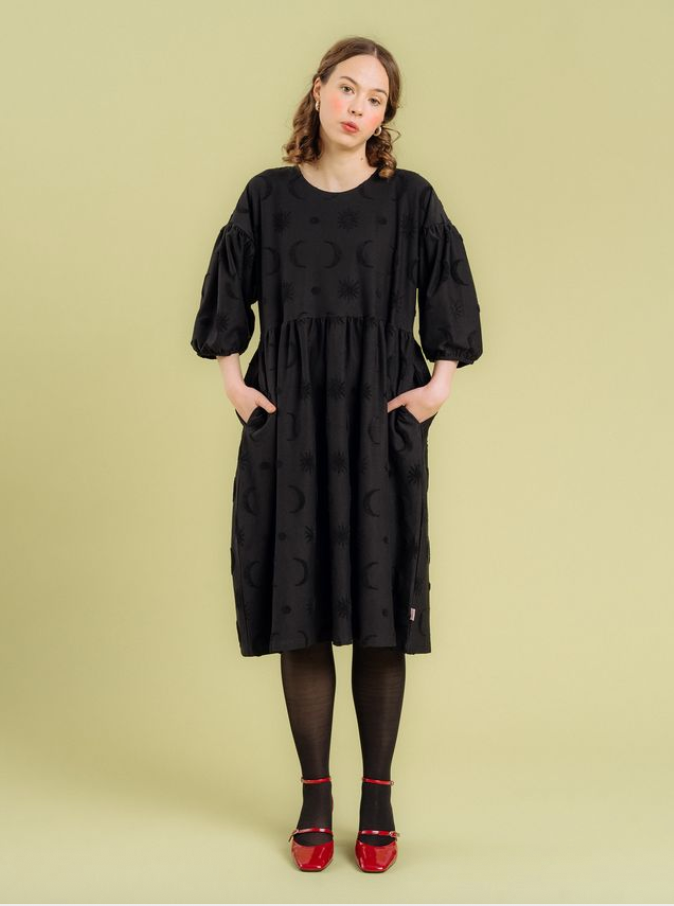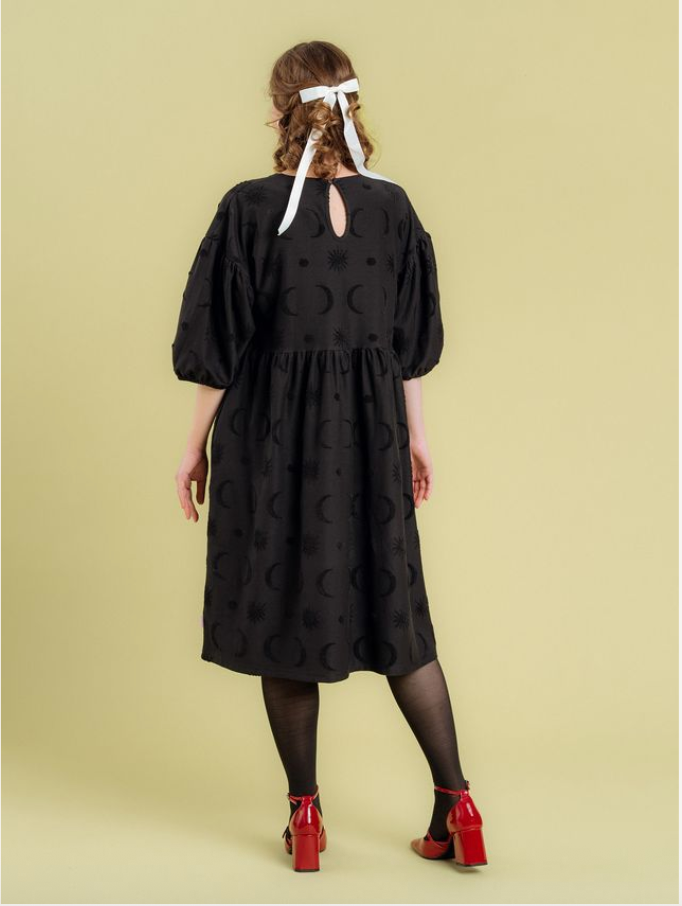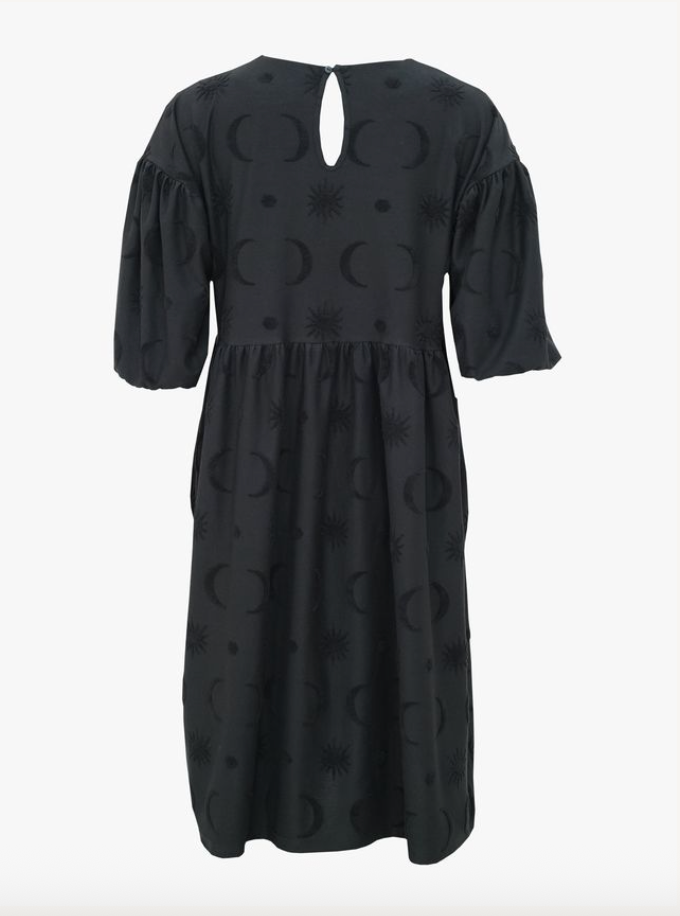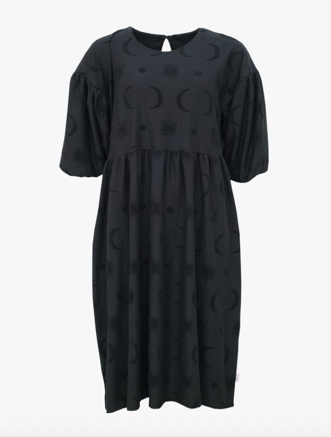 Divine struktuurineuloksessa froteemaiset, taivaankappale-aiheiset kuviot kohoavat neuloksen pinnasta, tuoden kiinnostavan yksityiskohdan mustaan mekkoon. Materiaali on hieman trikoota vahvempaa jakardineulosta. Materiaali ei sisällä elastaania, mutta neulos joustaa silti jonkin verran.