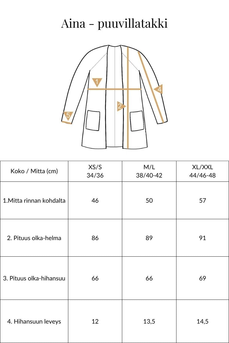 Käytä takkia neuletakin tapaan; se toimii niin housujen kuin hameiden ja mekkojen kanssa, ja istuu mukavasti myös takin alle. Monikäyttöinen Aina menee kesällä kevyenä takkina illan viiletessä, talvella se sopii sisällä kerrospukeutumiseen.