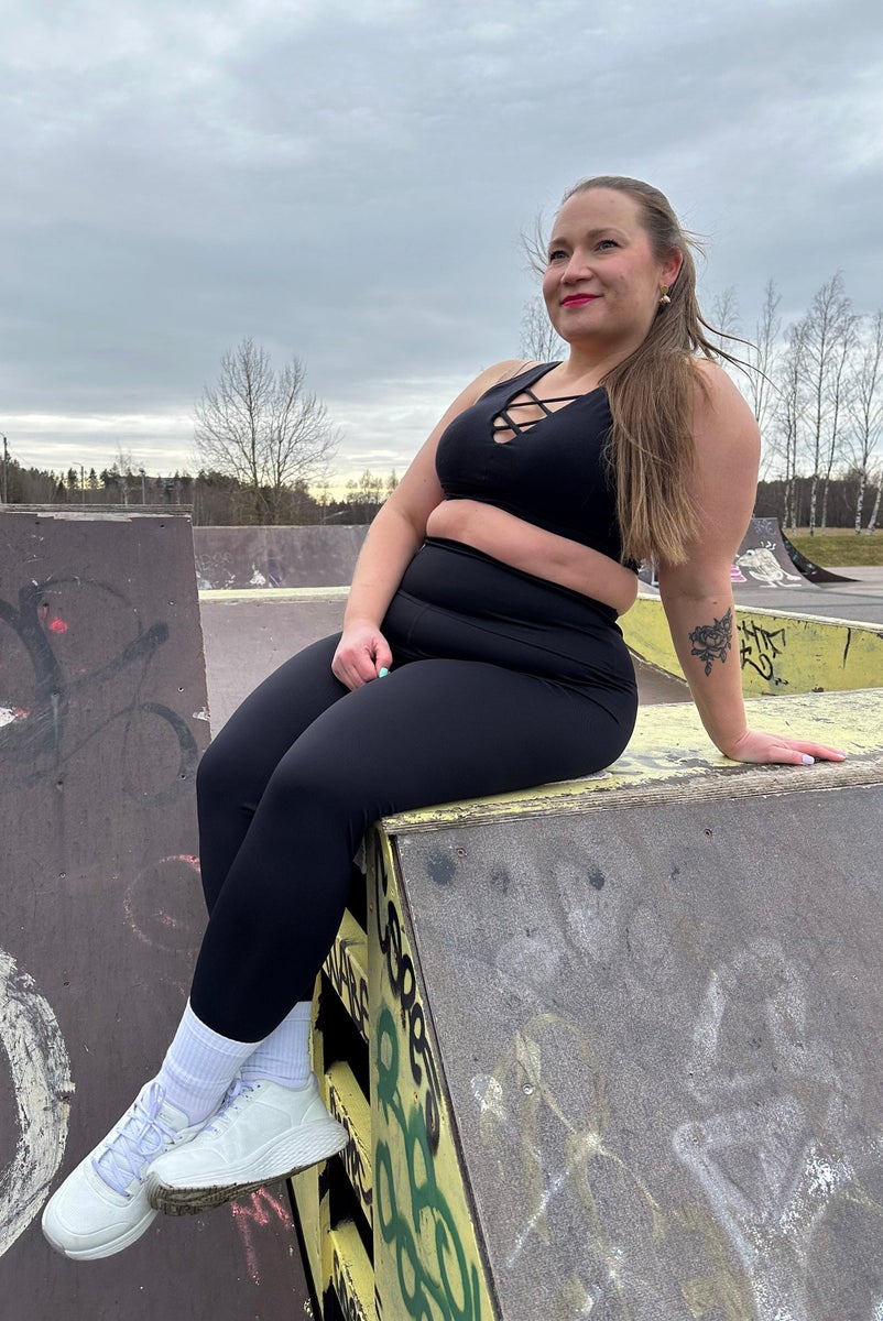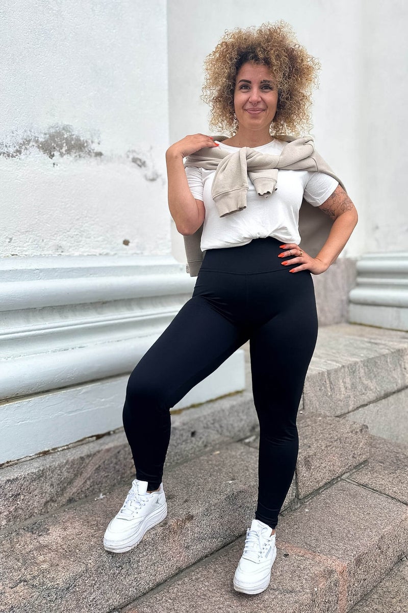 Näissä sporttitrikoissa on miellyttävä, kaksinkertainen korkea vyötärö, joka tukee mukavasti vatsaa. Vyötäröllä on takapuolella kuminauha, joten housut pysyvät ylhäällä reippaammassakin menossa ilman että vatsalle tulee puristusta.