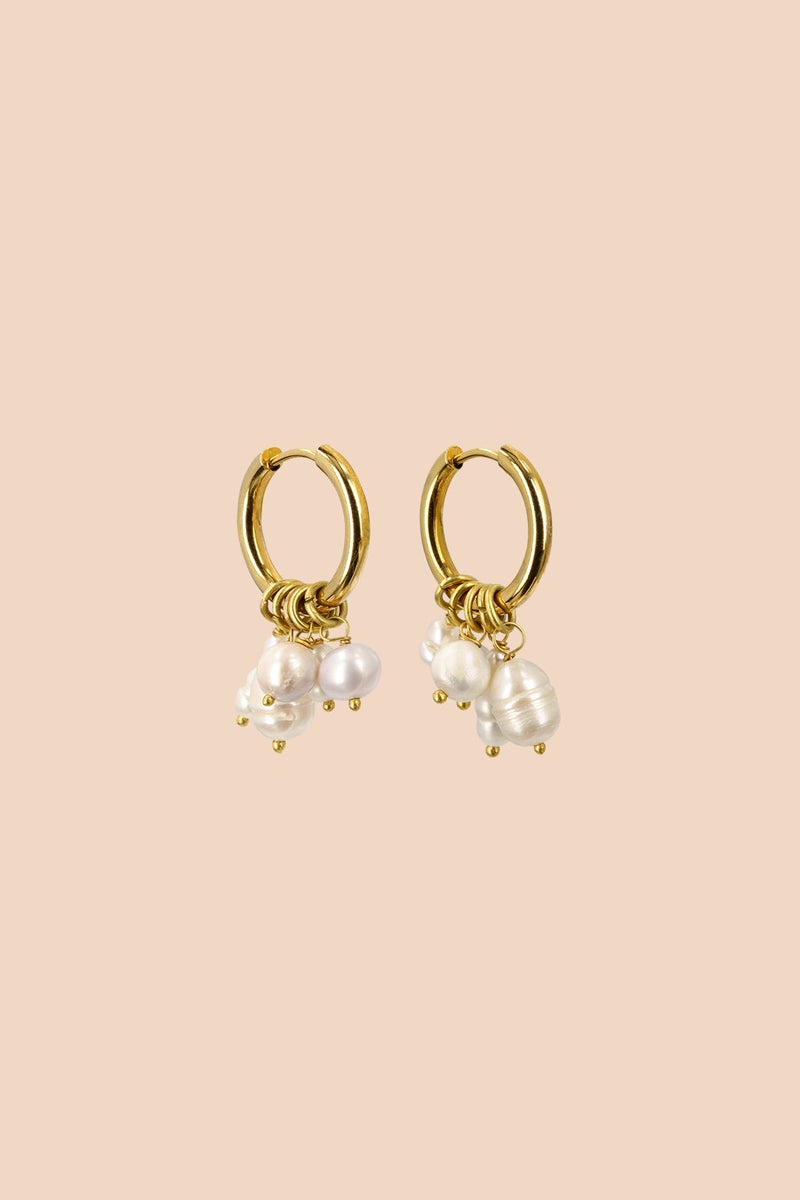 Näyttävät mutta kevyet helmikorvakorut, joissa kullansävyiseen teräsrenkaaseen on kiinnitetty ryhmä luonnonhelmiä. Helmien orgaaniset muodot tuovat koruihin eloisuutta ja uniikkia ilmettä. Ruostumaton teräs ja luonnonhelmet tekevät koruista kestävät ja ajattomat.