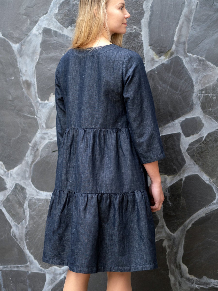 Mekko on valmistettu laadukkaasta eurooppalaisesta pellava-puuvilladenimistä, joka on miellyttävän kevyttä ja notkeaa. Pellava antaa kankaalle hengittävyyttä ja puuvilla sopivasti napakkaa ryhdikkyyttä.