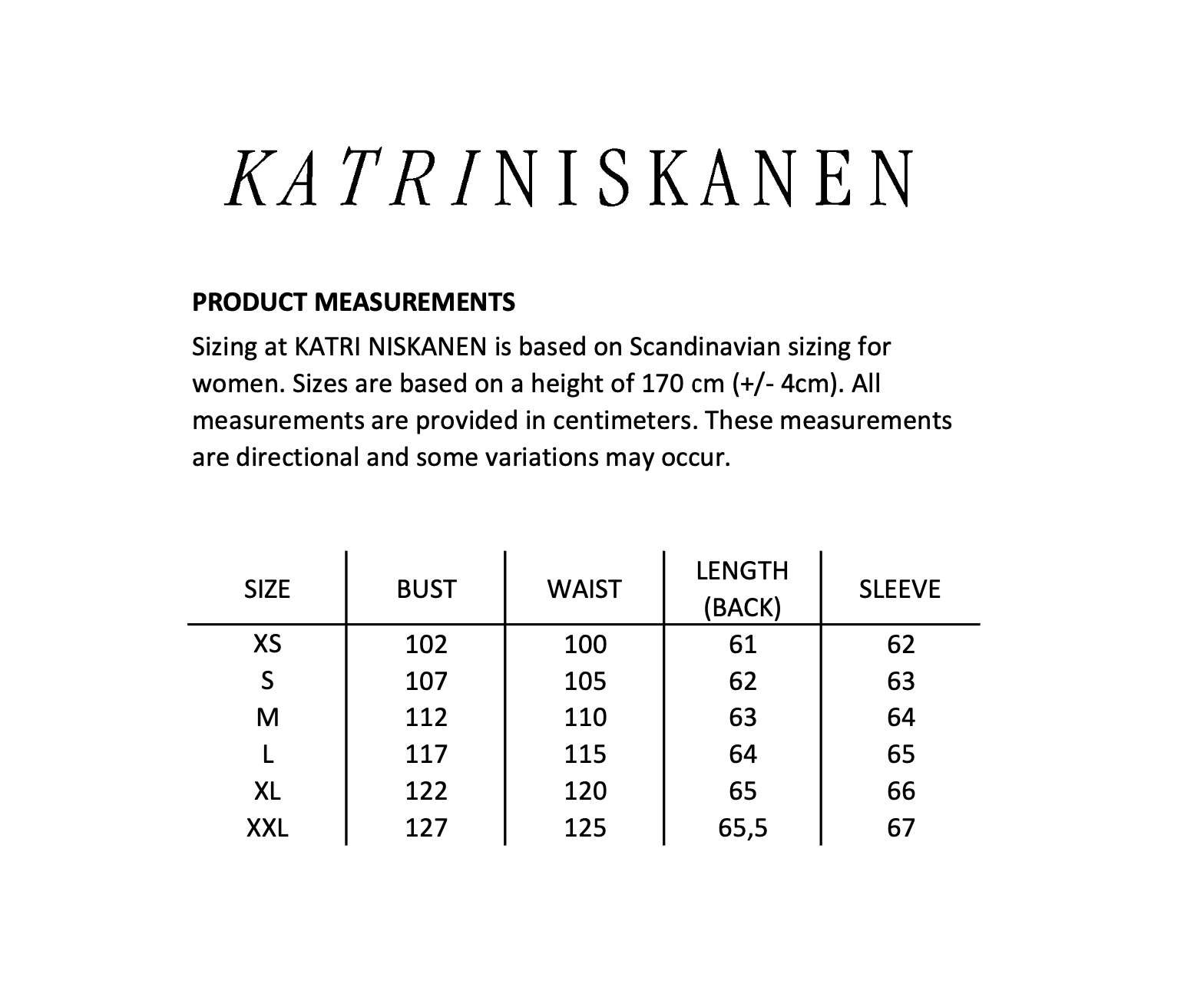 Puserossa venepääntie. Pitkien hihojen hihansuissa kuminauhat, jotka luovat kauniit frillat. Vuoritettu.