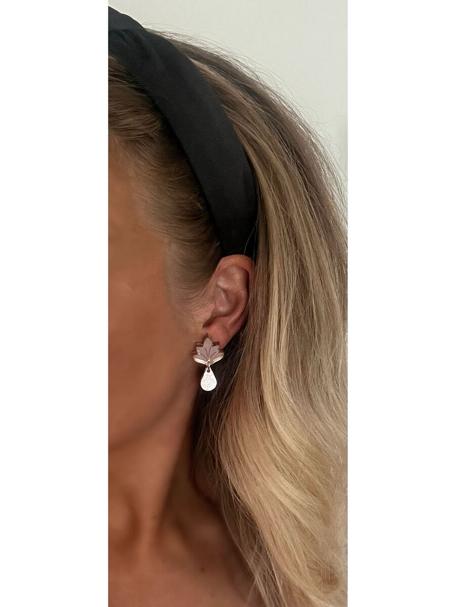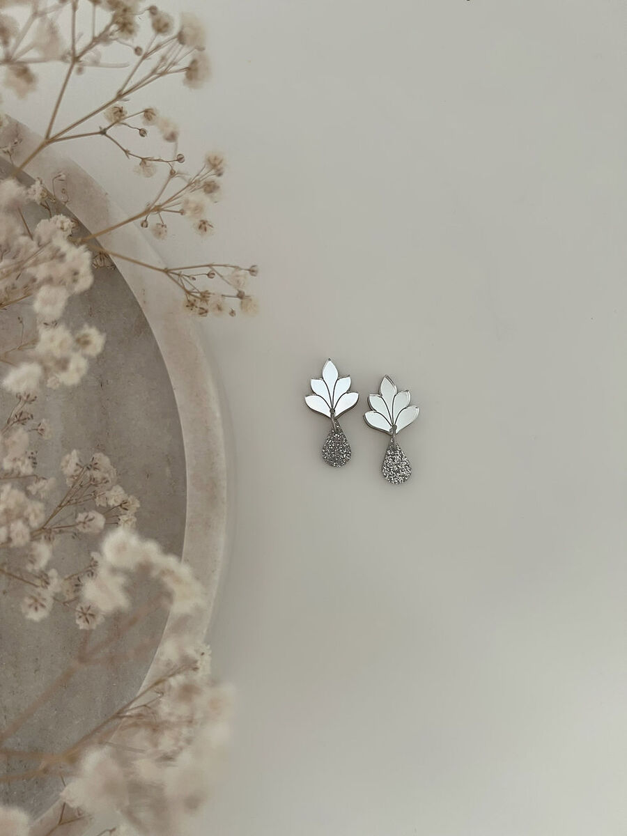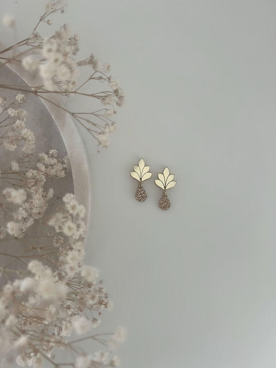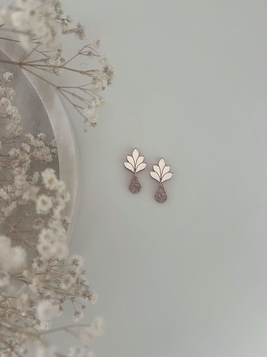 Kauniit lehtimäiset korvakorut, joista roikkuu glitteriakryylinen pisara. Nämä sopivat ihanasti niin arkeen kuin juhlaan!