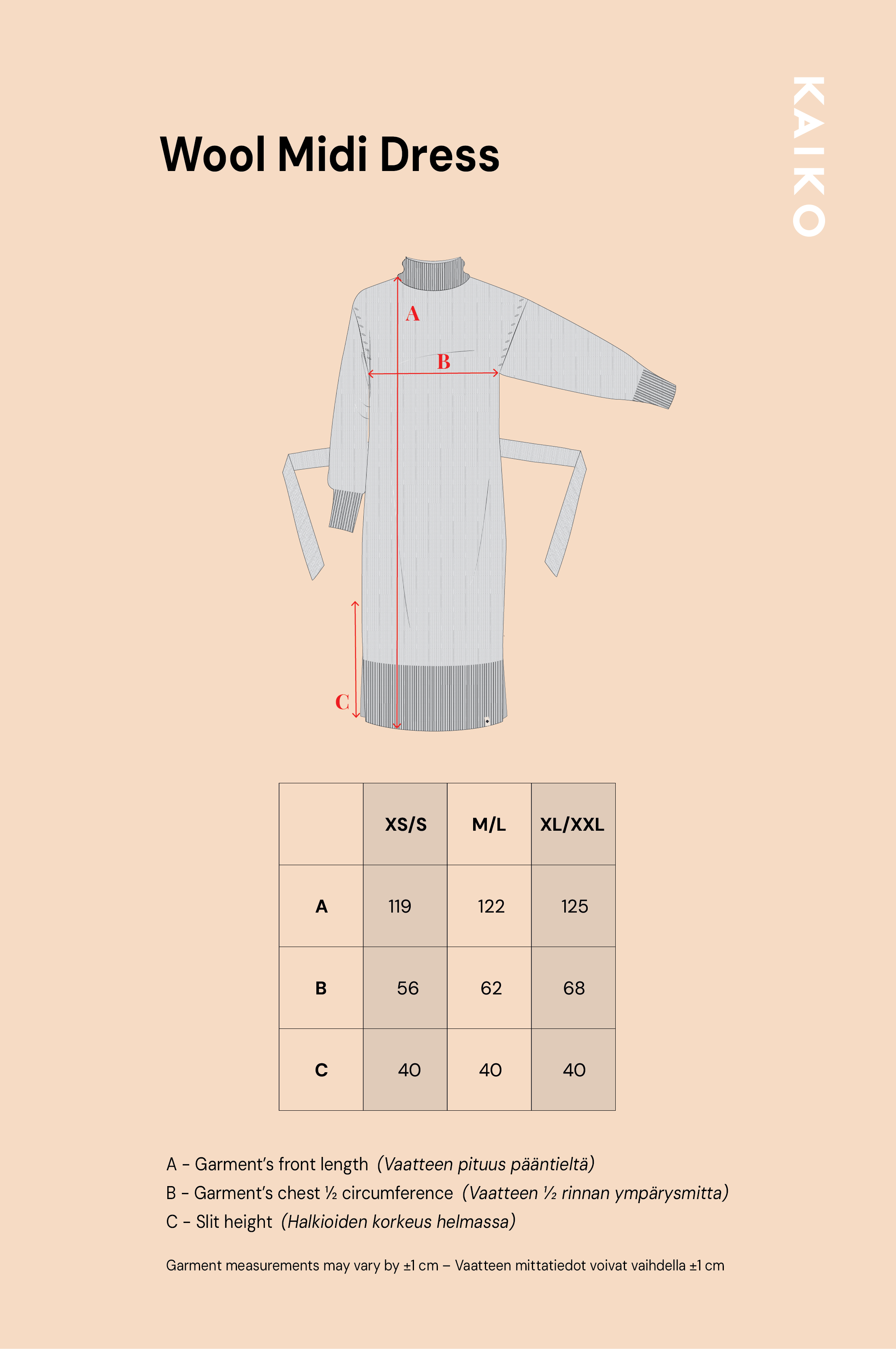 Kokotaulukon mitat ovat vartalon ympärysmittoja senttimetreinä. Vertaa omia mittojasi taulukon suuntaa-antaviin mittoihin. Huomioithan, että tuotteissa on erilaisia väljyyksiä. Vaatteita tilattaessa on hyvä huomioida, että mittanauhaa käyttämällä varmistat vaatteen sopivuuden ja vältyt turhilta palautuksilta.
