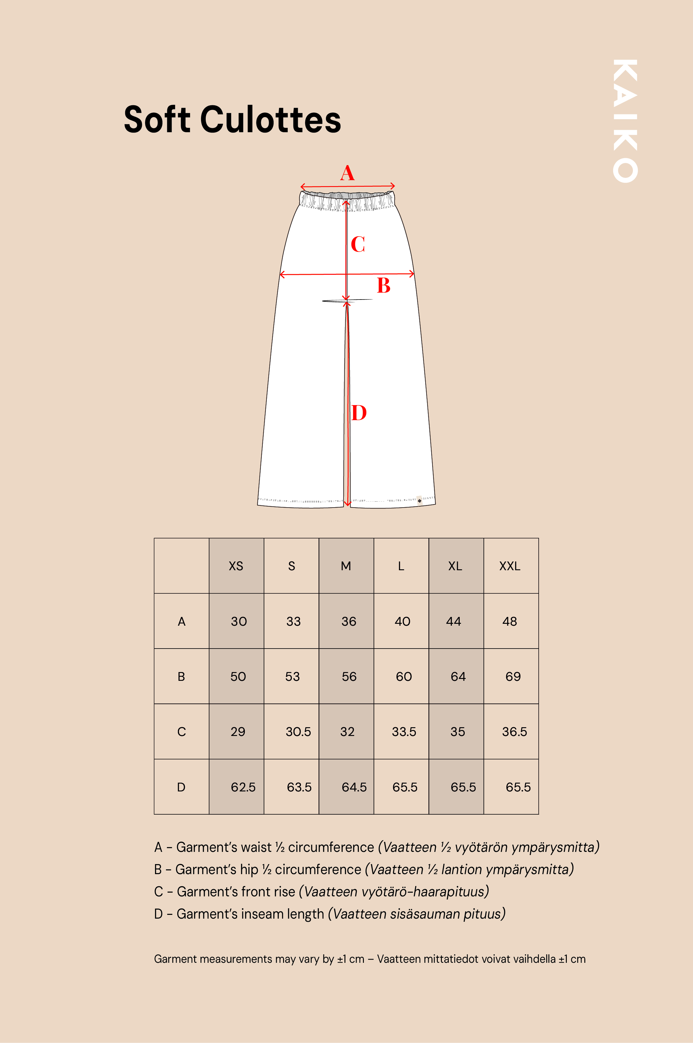Soft Culottes vastaa kokoaan. Suosittelemme valitsemaan housuista sen koon, jonka normaalisti valitsisit.