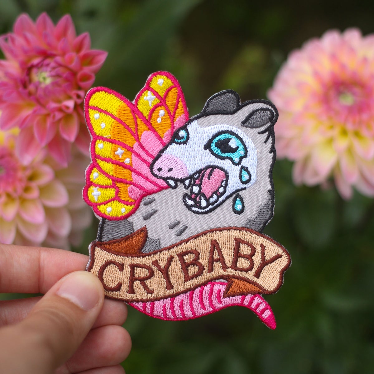 Inka Ruska -merkin Crybaby kangasmerkki.