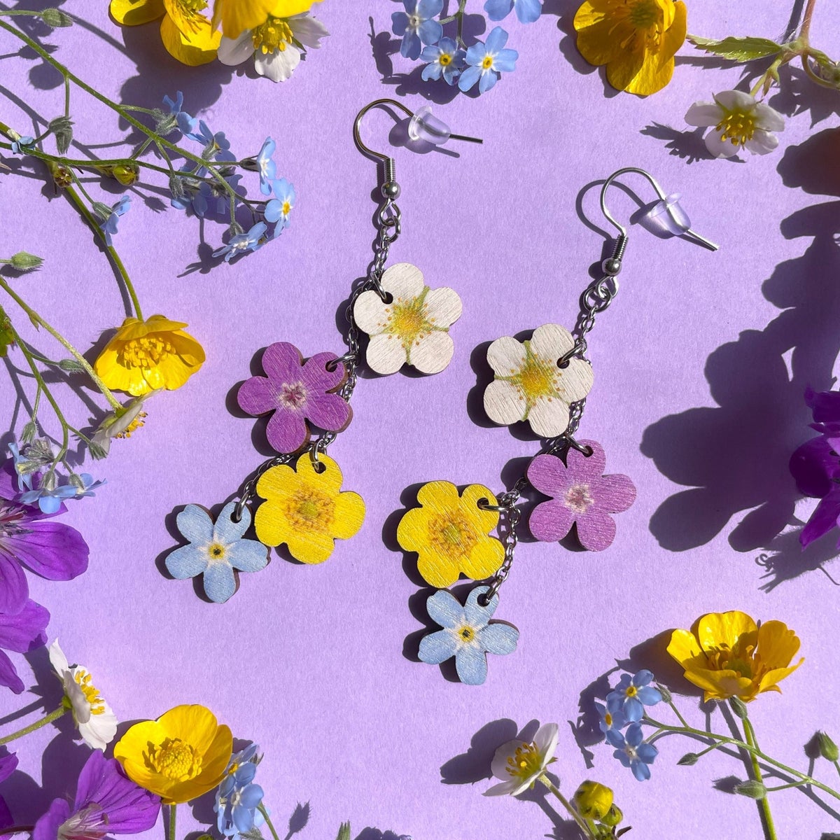 Tien vierustoilta ja kotinurmikoilta löytyvät alkukesän ihanat kukkaset ahomansikka, metsäkurjenpolvi, niittyleinikki ja lemmikki kukkivat läpi kesän näissä kepeissä korvakoruissa.